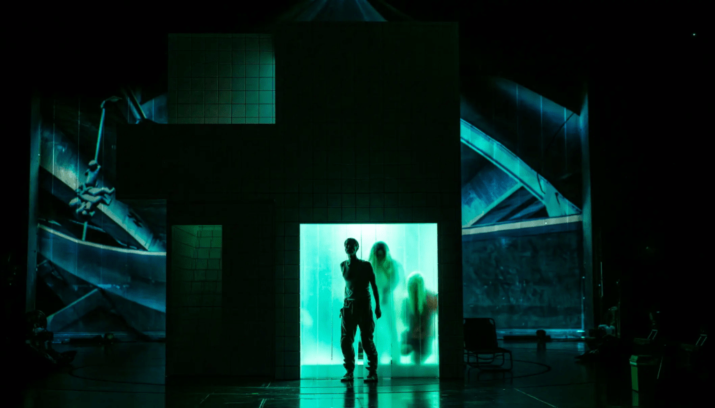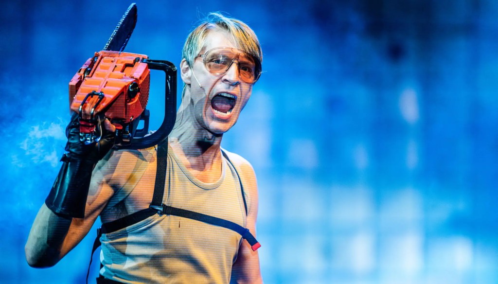 Det første vi møter er Sébastien Dupoueys videoarbeider og Nils Ostendorfs musikk. Bildene viser, nokså abstrahert, en verden som er i ferd med å gå i oppløsning. Alt er ute av kontroll, alt skifter plass. Fargene er dramatiske i grått, svart og rødt. Musikken er hard og faretruende. «Pent er stygt, og stygt er pent», sier de tre heksene (Trond Espen Seim, Alfred Ekker Strande og Jonas Hoff Oftebro) med vrengt lyd på stemmen. De har lange parykker og etablerer en røff og teatral spillestil. Midt på scenen står en hvit, flisekledd «borg». Den har to etasjer med takterrasse. Den kan minne om svindyre luksushus i funkisstil, men understreker også noe kaldt, menneskefiendtlig og brutalt. De glatte veggene brukes til å projisere video på. Bygget er plassert på dreiescenen slik at perspektivet forandrer seg underveis. Dette fungerer godt. Spesielt i filmatiseringene (ikke i Kurosawas) møter vi et goldt, tåkete, rått og fuktig Skottland, men ikke her. Noen av videoene viser et bylandskap med palmer, neonlys, biler og lyktestolper. Jeg skimter asiatiske skrifttegn – koreansk eller kinesisk? Settingen får et universelt preg. Kostymene er moderne. Skinndresser, lange kjoler og gullenker hinter til mafia- og gangstermiljø med sin hang til luksusmote. Noen steder bruker krigerne en slik «brynjehette» som skuespillerne i Polanskis film bruker. Et lån herfra kanskje? Macbeth (Ole G. Furuseth) har ikke sverd, han kriger med motorsag, og hans krigervenn Banquo (Ole Johan Skjelbred-Knudsen) bruker et balltre i metall som våpen.
