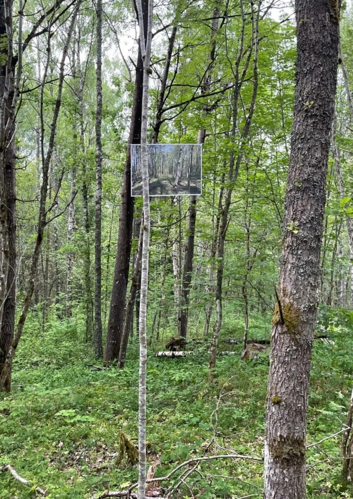 Tida går der vi sitter på kvisthaugen og av og til må åpne paraplyen for å unngå å bli gjennomvåte. Men tida blir fylt og fin. En pelsball kommer til syne langt inne i skogen – er det bison eller bever? Den ruller, den gis liv – animeres. Den lager ikke lyd som vi kan høre. Etter hvert kommer en skinnende skapning, langt inne i skogen den også, på vår høyre side. Den er høyreist og kan minne om en drage eller dinosaurus. Mens den går forbi langt der inne, skimter vi inni skogen på vår venstre side, noen menneskelignende, hårete dyr som løper. En stor uformelig hvit, rosa og gul skapning beveger seg også i skogen. De tar ikke kontakt med oss, de bare er der sammen med trær, insekter og fugler, før de forsvinner igjen. Til slutt kommer en sverm med små mennesker med masker. Maskene gir dem et insektpreg. De stopper et stykke fra oss og blir stående en stund før de forsvinner.