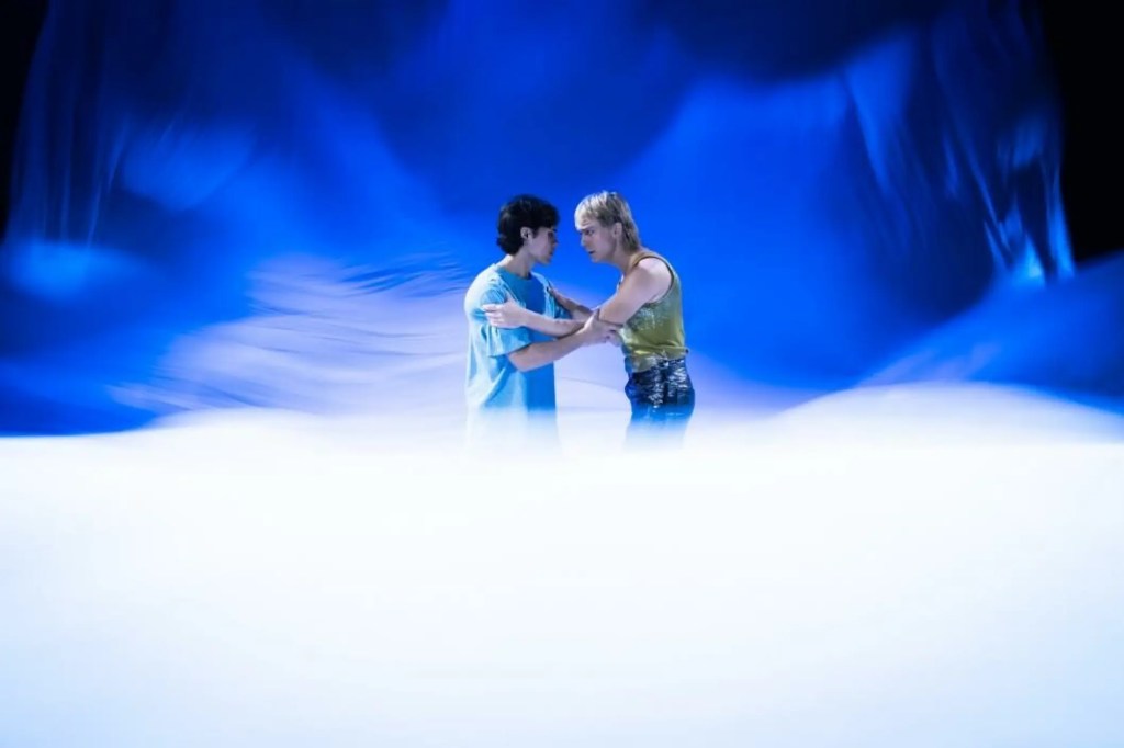 Peter Pan og gutten: Fredrik Høstaker og Vegard Bjørsmo, i «Peter Pan», regi: Fredrik Longva. Oslo Nye Teater 2024. Foto: Lars Opstad