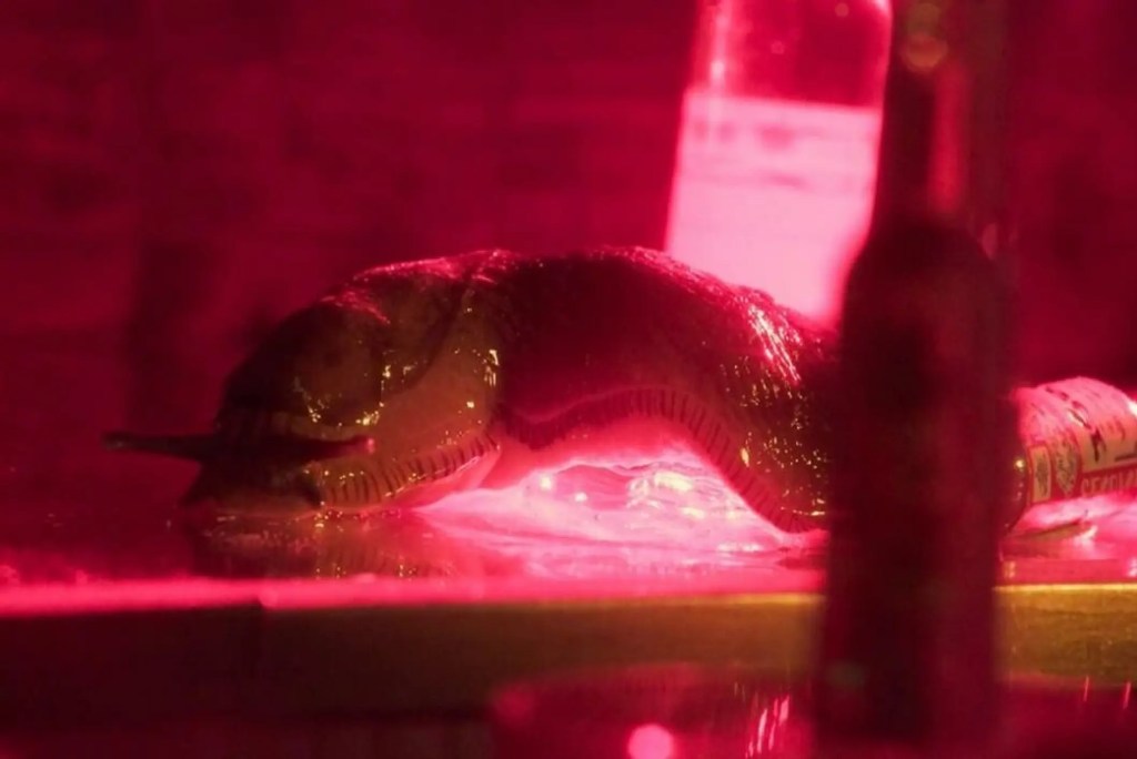 Brunsneglen, også spilt av Bjørn Sundquist, i «Triggersystemet – 1: ‘Vivariet’» av Tore Vagn Lid og Transiteatret-Bergen. Black Box Teater 2024. Foto: Transiteatret-Bergen