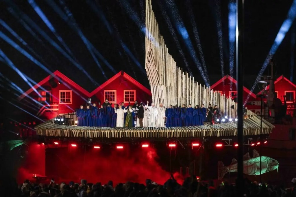 Men hva var nå dette åpningsshowet som er presentert av Raymond Enoksen og phase7 fra Berlin? Scenen er formet ørebeinet på en torsk – en otolitt. På dette beinet kan man lese hvor gammel torsken er, på samme måte som man kan lese årringene på et tre. Scenekonstruksjonen kan også minne litt om formasjonene som nordlys kan skape. Scenen er bygd på vannet i havna i Bodø. Og mirakuløst nok, har den stått i storm og orkan mens SAS-hotellet like bak har fått fasadeplater og vinduer blåst ut. Været har vært så pass ille at det ikke kunne bli gjennomført en ordentlig generalprøve, fortalte teatersjef Birgitte Strid som har hatt en finger med i regien på forestillinga. Forestillinga som varte en halvtime, hadde blant annet med dansere fra Bodø vgs og profesjonelle samiske musikere – John André Eira og Ella Marie Hætta Isaksen. Hun avslutta med en storslagen låt og med politisk snert. Før hun sang spurte hun publikum om de hadde hørt et pite- eller lulsamisk ord fra scenen denne kvelden. Og som den aktivisten hun er, åpnet hun etter at hun hadde sunget, kostymet sitt og viste fram teksten: «This is sami land». Akkurat dette ble kuttet ut i versjonen som ble vist på NRK. Men ellers var ikke åpningsshowet så veldig mye å skryte av. Det var nesten umulig å se noe som helst fordi den flotte scenen var så langt unna. Og hva var teksten den unge jenta (Hannah Schulte Strid) og den eldre mannen (Reidar Sørensen) framførte: «Alt er sirkler». Jo, jo, tekst fra Løvenes konge – «Circle of life». Selvlysende torsker på små gummibåter sirklet rundt scenen. Er det på grunn av fiskeforet i mærene at de lyser neongrønt, eller er det fordi bunnfisken torsk spiser radioaktivt avfall? En nordlandsbåt med motor kjørte forbi, full av nordlendinger i nordlandskofter og bunader, alle med hvit hud, alle smilte og vinket. Sa noen klisje? Men fyrverkeriet var flott, og byen var stappfull av mennesker. Og det blir nok forhåpentlig noen interessante kunstprosjekter utover året – vi håper på det og skal følge godt med. Kanskje blir det teater også?