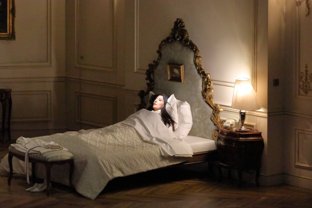 Marina Abramović ligger med lukkede øyne i et aristokratisk soverom. Foto: W. Hösl