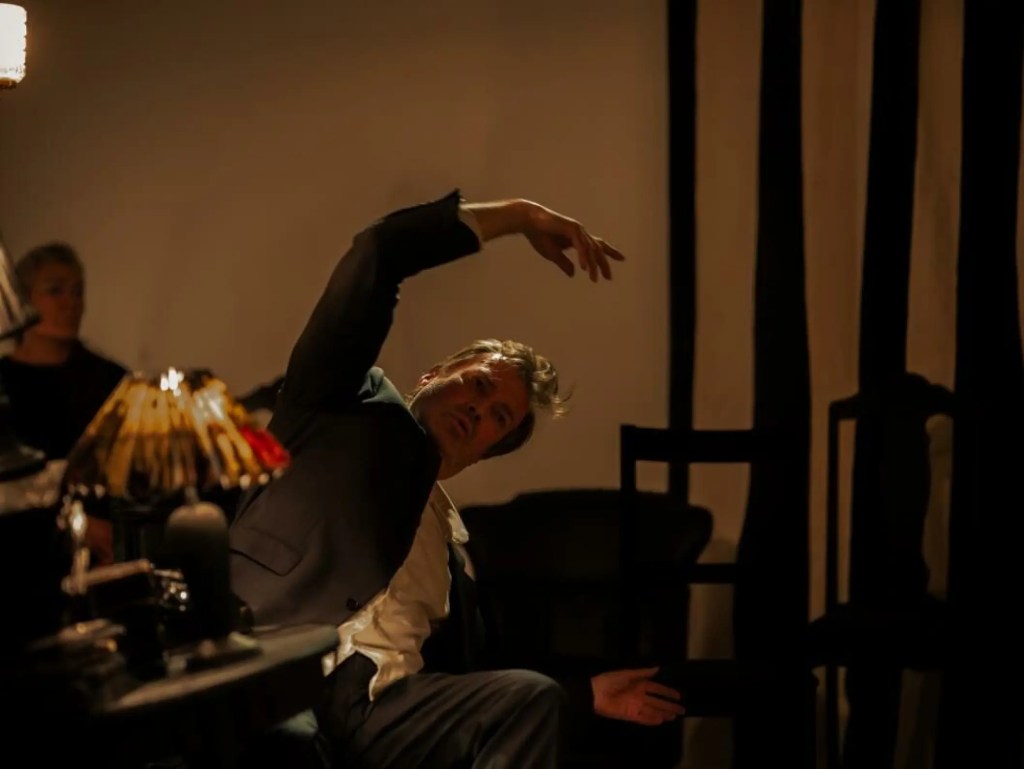Skuespiller Gisle Hass og Liv Kristin Holmberg (i bakgrunnen), i «Resultat garantert». Spriten kunsthall, Skien 2024. Foto: Manuel Madsen